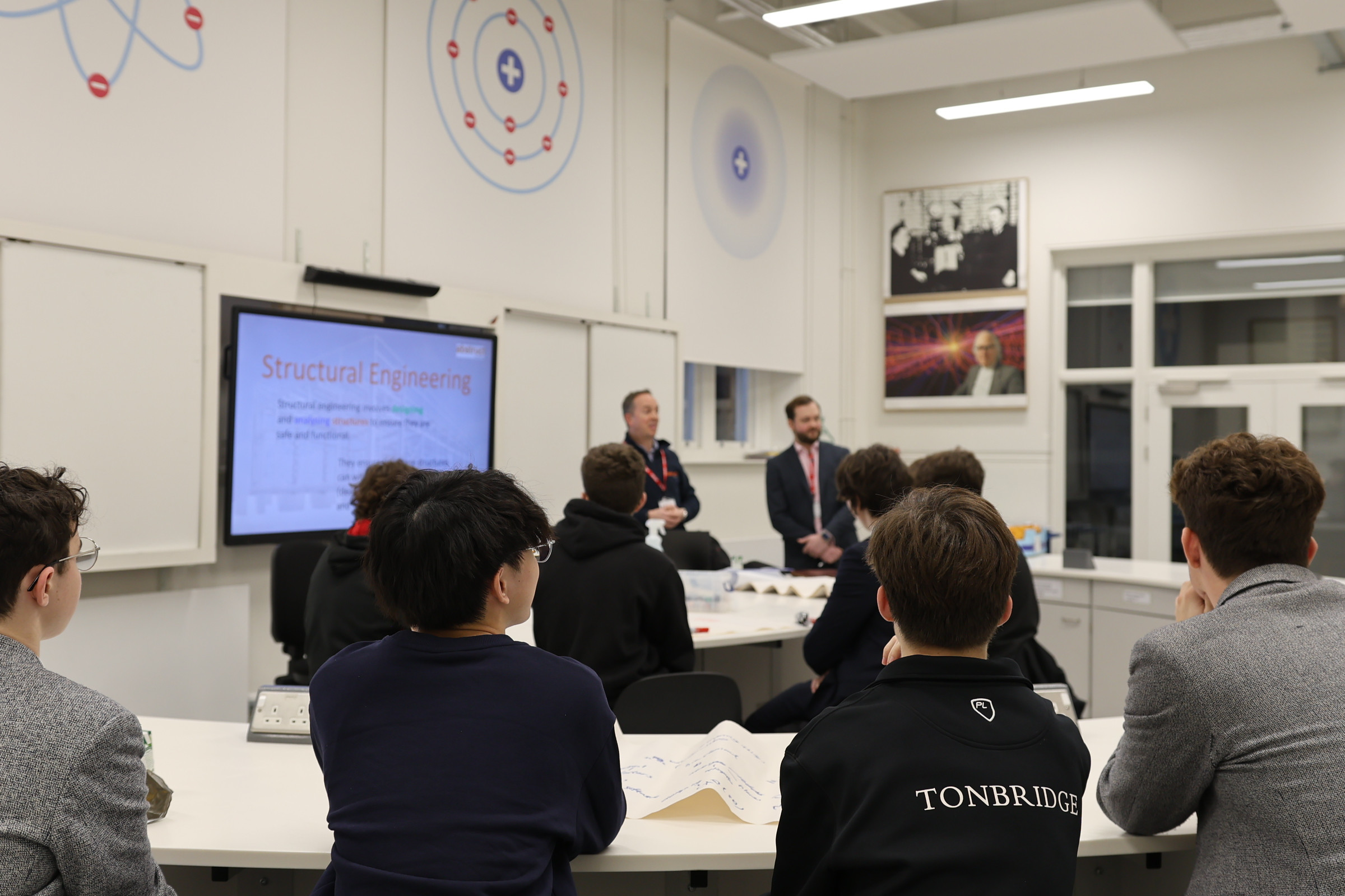Adrian Boult (MD) and James Burton (Associate) were privileged to have been recently invited to present a talk to a group of boys in the Engineering Society at Tonbridge School. The presentation raised the questions of “What is Engineering?” and “What do Structural Engineers do?”. The interactive and exploratory session touched on topics such as key structural materials we design with, where these are commonly used and the different sectors we work in. Adrian and James also spoke about their own differing career paths in structural engineering which was followed by a discussion about the various career routes in engineering nowadays available for the students to consider.